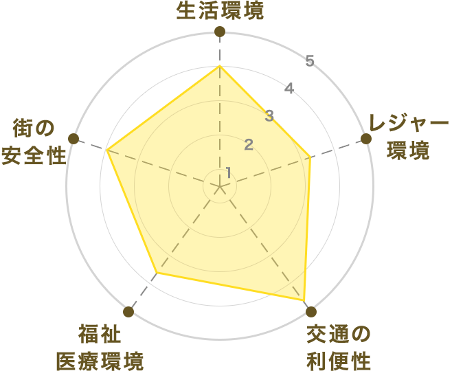- 駅周辺の住宅地は平たんな道が多く凶悪犯罪が少ないなど落ち着いた環境が魅力、北側の「風致地区」に指定されたエリアでは良好な自然的景観が維持されている
