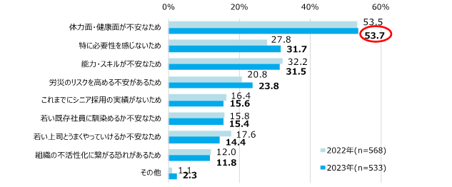 一方で、今後シニア層を採用したくない理由は、「体力面・健康面が不安なため」で53.7%と最も高くなった。