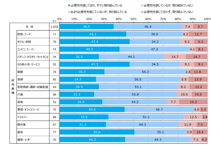 業種別に見ると、必要性を感じている割合が高い[事務・オフィスワーク]では48.0%、[建築・土木]では51.4%と約5割にとどまった。