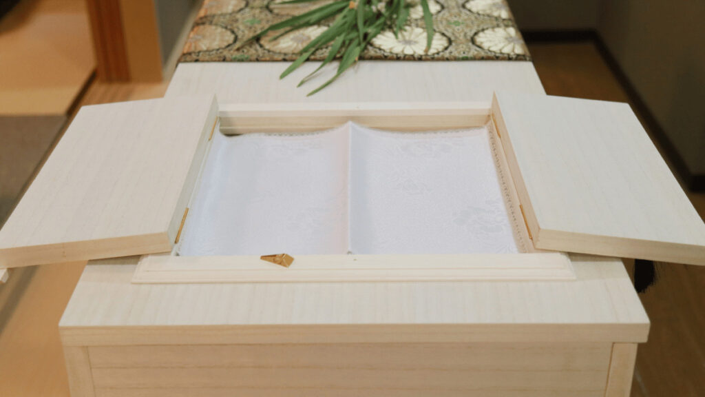 そして最後のお別れに皆で花を1本ずつ棺に添えたところで、私は日本酒の空き箱を入れた。